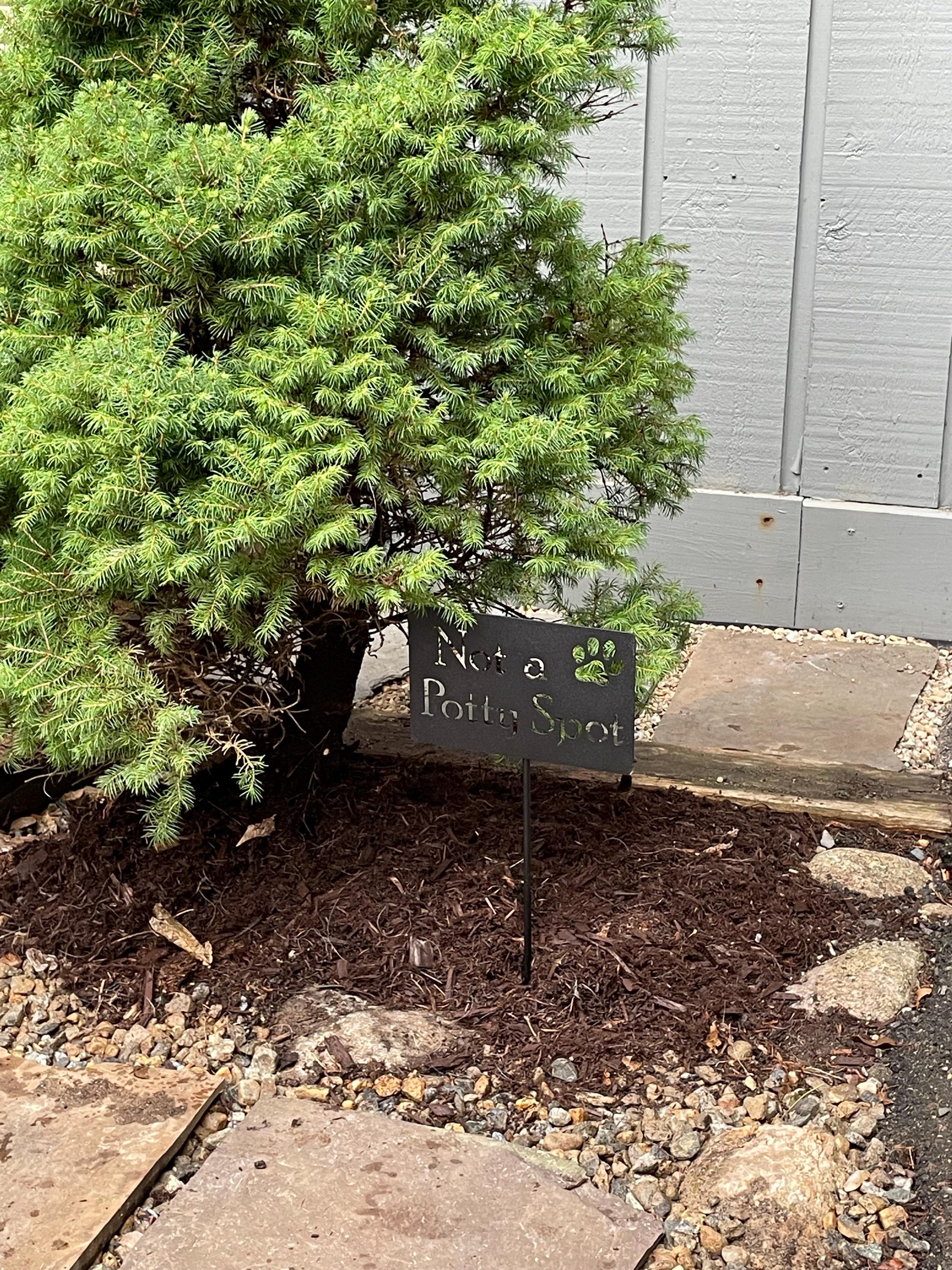 Not a Potty Spot metal sign is a great warning for guests and passersby! Gently ask dog walkers not to use your lawn and garden as their potty stop! This rustic garden stake is easy to add to a large planter or place anywhere in the landscape or garden. It's large enough to stand out on its own but still fits into planters.
