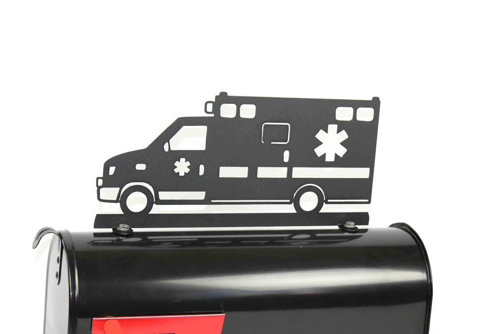 Ambulance Metal Mailbox Topper proudly displays your profession or volunteer cause. This topper makes a great appreciation gift for a first responder! Topper is cut from steel about as thick as a nickel. Small tabs are bent for easy attachment to mailbox.