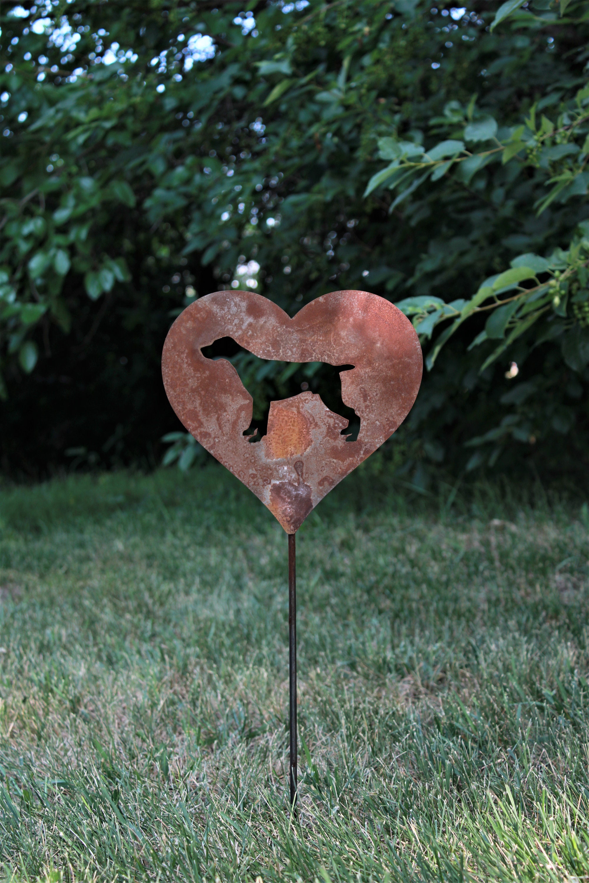 The dog heart is cut out of steel about as thick as nickel and welded onto a steel rod. This makes a very durable garden stake.